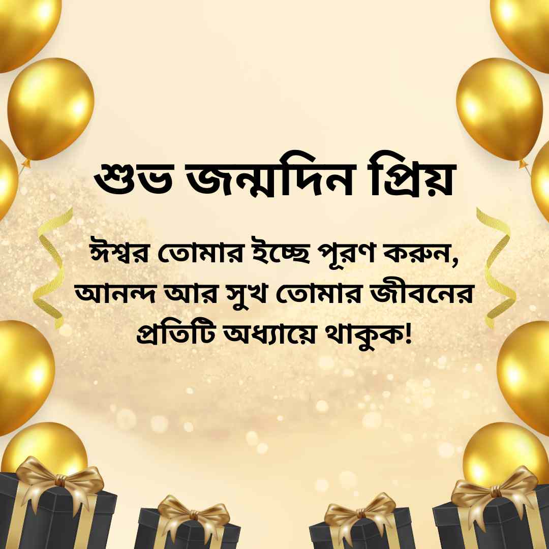 - শুভ জন্মদিন প্রিয়! তোমার জীবন যেন সুখ, সুস্বাস্থ্য আর ভালোবাসায় পরিপূর্ণ হয়। সেরা সময় কাটাও! 💐😊