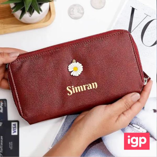 Crafted from premium vegan leather, this chic wallet features a daisy charm and bold cherry red hue. It offers multiple slots for cards, cash, and even a mobile phone. Compact yet spacious, it’s both stylish and practical.