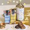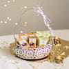 A magnificent celebration of abundance, this luxury Diwali hamper unites spiced hibiscus & rose floral tea, doda barfi sweets, luxury gardenia scented candle with black pepper cashews, salted roasted almonds, salted roasted cashews, peri almonds, centre filled chocolate cookies, pistachios, almond biscotti fingers, Levantine sweets box- Kaju burma, Dates ezme with rose petals & sesame barks, floral canister with 2 health bars, date bites and, soan papdi. Finished with a german silver basket and pearls, it reflects the true grandeur of the festival sitting perfectly in a two feet long wooden tray. A premium choice for corporate Diwali gift hampers or family Diwali hampers.