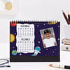 Fuel your child's fascination with the universe while staying organized with this space-themed desk calendar. Each A4 page features a personalized picture of your kid with a captivating glimpse of outer space, igniting the imagination of young stargazers. With two months printed on every page, this calendar keeps your child organized while sparking their curiosity about the universe. What makes it truly special is the personalized image of your child, adding a unique touch.