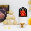 Embrace divine charm and festive joy with this Ganesh Chaturthi gift hamper. It features a vibrant Orange Ganesha statue showpiece that radiates positivity and blessings. Alongside, a beautifully crafted metal diya with an intricate floral design adds a traditional touch to pooja rituals. To complete the celebration, the hamper includes delectable Badam Modaks, a festive delight loved by all. Thoughtfully curated, this hamper makes a perfect offering to Lord Ganesha and a meaningful gift for family and friends during the auspicious occasion.