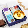 Delightful surprises and blessings for your sibling, wrapped up in a hamper. Arranged in a blue tray, this hamper includes almond praline, oreo almond, Velvety Bar Milk and Dark Chocolates, moli, roli-chawal, and a gold-polished puja thali so you can perform the ceremony. Indulge your taste buds with an assortment of sweet delights, creating happy memories. Gift this hamper to your brother, extending your warmest wishes.