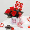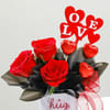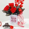 Sweeten up your Valentine's Day with this thoughtful and heartwarming gift. Featuring stunning red roses wrapped with soft black frosted sheet and a red ribbon, hand-arranged in a white ceramic mug, this arrangement is the perfect blend of elegance and charm. The mug reads A Hug In A Mug in playful script, making it a keepsake your special someone. To make it even more delightful, 3 heart-shaped chocolate sticks and a red and white Love acrylic tag are included. This gift is sure to bring a smile to your loved one's face and make their Valentine's Day unforgettable.