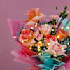 Gift a burst of beauty wrapped in elegance with this radiant bouquet designed to express love and warmth Featuring a charming blend of Harmosa roses sweet avalanche roses and light pink spray carnations it is delicately highlighted with blue sprayed gypsos for a graceful contrast Wrapped in soft pink tissue and a frosted blue sheet and finished with a pink lace ribbon the bouquet glows even brighter with warm string lights Perfect for birthdays anniversaries or just because this bouquet leaves a lasting impression on every occasion.