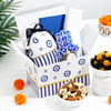 Spread Diwali joy with the Blue Burst gift hamper, perfect for making your team feel valued. Presented in an evil eye box, it includes a Hamsa hand tealight holder, an evil eye potli, a sleek blue notebook and pen, Velvety Bar Milk Chocolate, a dry fruit mix, a berry mix, and a Diwali greeting card. Personalize the card with your brand logo, making this gift perfect for vendors, clients, and employees. Note: We can make customized boxes for the MOQ above 500. Below that, we can customize our existing boxes, sleeves, etc., with your logo. Please connect with us for more.