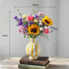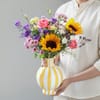 Radiant blooms come together in this artisanal arrangement, bringing a sophisticated burst of sunshine to any space. Presented in a striking yellow-and-white striped glass vase, it creates a warm, joyful ambience with effortless style. - Total No.of Stems: 14 - Sunflowers, Pink santini, Limonium, Yellow carnations, Noblesse roses, Purple lisianthus - Vase, Yellow & white striped glass - *This arrangement will be delivered in an Interflora Luxury Box. - Height: 48 cm / 19 inches - Width: 30.5 cm / 12 inches