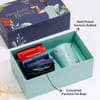 Gift them a comforting dose of relaxation with this elegant tea hamper. It includes 12 aromatic tea sachets in delightful flavours like Warm Assam, Magical Cinnamon, Barron Earl's Grey, Spiced Turmeric, Mellow Hibiscus, and Fresh Moringa Tulsi. A blue artisanal kulhad with 18-carat gold embossing, a jar of Peri Peri Millet Mix, and a personalized coaster reading Keep Calm And Drink Chai make this a thoughtful gift for every tea lover.<br>- Tea Lovers Dream: 12 premium tea blends for every mood and moment.<br>- Elegant Touch: Blue kulhad with 18-carat gold detailing and a stylish coaster.<br>- Personalization: Personalize the coaster with their name for a unique touch.