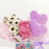 Surprise Mom with a gift that blossoms with love. This charming floral mug arrangement features a crisp white ceramic mug, lovingly inscribed with Mama and her name. Nestled within this special mug are elegant white santini, deep purple roses, and sweet lavender heart keychains. The arrangement is artfully presented, embraced by a soft pink frosted sheet and tied with a delicate purple tissue ribbon. Personalize the mug with mom's name for a delightful keepsake that combines the beauty of flowers with a practical and heartfelt mug she will cherish.
