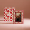 Celebrate your favourite moments with this charming photo frame, designed in a classic checkered pattern with adorable heart accents for a playful, heartfelt touch. Perfect for desks, shelves, and bedside tables, it adds warmth and personality to any space while beautifully showcasing your treasured 4x6-inch photographs. Handcrafted in premium faux leather with an MDF base and clear glass front, this frame blends durability with style, making it a lovely addition to your decor or a thoughtful gift. - Features: - Handcrafted faux leather finish - Classic checkered design with heart accents - Material: Faux leather, glass and MDF - Colour: Pink, Red and Cream - Size: 4 x 6 inches - Care: Do not use alcohol-based cleansers; use only white solvent.