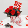Celebrate love in the sweetest way with this charming Valentine's Day rose and chocolate mug arrangement, thoughtfully curated to impress at first glance. Featuring fresh red roses elegantly arranged in a white ceramic mug, this romantic gift is accented with three red heart-shaped chocolate sticks for a delightful surprise. A red and white LOVE acrylic tag adds a playful touch, while the heartfelt message on the mug enhances its sentimental appeal. Perfect for Valentine's gifting, this keepsake beautifully blends flowers, chocolates, and a reusable mug into one memorable expression of love. - Details: