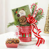 Bring a touch of Christmas magic to your celebrations with this graceful mug arrangement. Nestled in a white mug adorned with delightful Christmas designs, the arrangement features lush cypress leaves, a gold-sprayed pine cone, candy canes, and a festive red and white ribbon. Adding to the holiday spirit are a delectable plum cake and a white Christmas tree cutout decoration. Perfect as a thoughtful gift or a cosy decor piece, this arrangement captures the essence of festive cheer in a graceful and heartwarming way.
