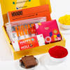 Indulge in a Holi experience that delights the senses with this beautifully curated hamper. A rich and decadent Velvety Bar Dark Chocolate, wrapped in a festive Happy Holi sleeve, brings sweetness to the celebration. Two assorted organic gulals add vibrant hues to the festivities, while the Hivado Big Mini Set, featuring body wash, shampoo, face wash, body lotion, face cream, conditioner, and AM PM cream 30ml each, ensures post-Holi pampering. A heartfelt greeting card is also added for Holi lovers. Personalize the card with your brand logo and gift it to your vendors, clients, and employees.