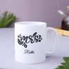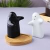 Black and white, yin and yang, male and female; opposites but complementary. Here is a set that represents this concept of different yet similar. The wooden black tray contains a hugging salt and pepper shaker set. a black mug for him and a white mug for her. Personalize the mugs with names.