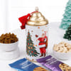 Elevate your celebrations with this indulgent selection, the perfect hamper embodying the spirit of Christmas. Arranged beautifully in a reusable handwoven jute basket, this hamper includes Velvety Bar mixed berries chocolate, jute potli, mince pie and brownie tart, kulfi dragees, raisins, roasted and salted cashews, canisters, a glittering reindeer, a candle, and a rich fruit cake. To add a touch of elegance, an exquisite acrylic Christmas tree ornament is also included in this hamper.