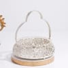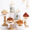 Bring home the spirit of Diwali with this elegant festive hamper, thoughtfully curated for the season of light. Featuring three ornate storage jars in a German silver-plated basket, the set is surrounded by premium dry fruits like almonds, cashews, dates, and caramel-coated nuts, beautifully presented in gold-toned pedestal bowls. A festive candle and incense stick add a warm, aromatic touch to this luxurious arrangement. Perfect for gifting or personal celebrations, this hamper blends traditional charm with modern elegance to make every moment more special.