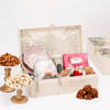 An exquisite Diwali Hamper crafted to add grandeur and warmth to festive gifting. Light up the season with multicoloured candles, a metal lotus urli set of two, and a decorative elephant symbolizing prosperity. Indulge in Salted & Roasted Almonds and Cashews, and rich Dodha Barfi, paired with Eternal Tulsi Luxury Bamboo-less Incense Sticks and Hawan Cups Set for a divine ambience. Beautifully packed in a majestic potli and the Majestic Elephant Lacquered Box, with a festive greeting card, this hamper is a perfect blend of tradition and elegance.