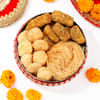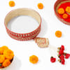 Add elegance and tradition to your Karwa Chauth celebration with this Extravagant Red Thali Set. This beautiful hamper consists of the Karwa Chauth Puja Samgri which includes essential pooja items like Kalash, chunni, channi, bindi, kajal, sindoor, and a mehendi cone. This hamper is completed by delicious plain mathri, sweet phirni, and gud shakkar para in a sargi box. Accompanied by the yellow potli, it is adorned with beautiful embroidery, giving the hamper a classy touch. Roli chawal is also included with a greeting card printed with the words Chauth Mata.