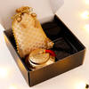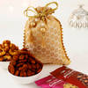 Light up the festivities with this exclusive Diwali hamper. Packed in a gift box, this hamper includes a metal candle container, peri-peri almonds, and Thai chilli cashews packed in a beige brocade potli, an acrylic LED lamp, and a greeting card. This thoughtfully curated hamper is a sensory delight of delectable treats. The acrylic LED lamp illuminates any space with a warm, inviting glow. Personalize the card, box, and LED lamp with your brand logo and gift this hamper to your vendors, clients, and employees, wishing them a prosperous Diwali.