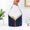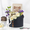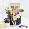 This thoughtful Father's Day hamper is a perfect gift for your perfect Dad. A heartfelt sandwich frame reads Best Dad In The World, while the other displays his cherished photo. Paired with a decadent chocolate jar cake, the gift is beautifully arranged in a reusable blue basket. Delicately adorned with white roses, purple statice, and white spray carnations, the arrangement is finished with an elegant white ribbon. A perfect blend of sentiment and sweetness, this hamper is designed to make Dad feel truly special. Personalize the frame with his favourite picture for a special touch.