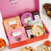 Make your Bhai Dooj celebrations a grand celebration with this Grand Festive Bhai Dooj Hamper. This hamper includes delightful Besan Laddoo, a traditional sweet that embodies the spirit of love and festivity. Experience the rich flavour of Dodha Barfi, known for its unique texture and taste. Enjoy the crunchy goodness of Velvety Bar Roast Almonds and Mixed Berries. For a classic touch, the hamper includes Plain Almonds and Assorted Cookies. Completing this elegant hamper is a stunning Gold Finish Puja Thali alongside Roli and Chawal, essential for your sacred pooja rituals.
