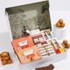 Curate an unforgettable Rakhi experience with this grand heritage rakhi celebration hamper. This exceptional rakhi gift for brothers boasts a stunning array of handmade rakhis, including the symbolic Tree Of Life with Red Meena and CZ Stone Work, Peacock Feather Meena Work, and elegant Kundan And Meena Work Rakhis. Indulge in traditional sweets like Chana Badam Barfi and Besan Laddoo, alongside four Masqa Velvety Chocolate Classic Milk. Two sets of luxurious La French perfumes Luxe, Elegant, Opulent, and Splendid complete this grand offering with Roli Chawal, honouring your bond.