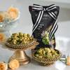 Step into the New Year with a thoughtfully curated hamper that blends gourmet indulgence with floral elegance. Rich center-filled choco cookies, premium pistachio crunch, roasted almonds and cashews, and nourishing protein bites create a balanced mix of pleasure and goodness. A beautifully designed white floral canister paired with aromatic spiced hibiscus and rose tisane adds a refined touch. Arranged in a panel tray adorned with fresh roses, carnations, and leather fern, and finished with a golden Happy New Year tag, it makes a graceful, feel-good present.