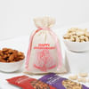 A heartfelt hamper crafted to celebrate timeless love. This Heartfelt Personalized His And Hers Anniversary Hamper features golden chai glasses adorned with His and Hers for those tea breaks, complemented by a delightful assortment of gulab jamuns, centre-filled choco cookies, premium cashews, and almonds filled in a potli that says Happy Anniversary. Adding a touch of whimsy, a charming You and Me caricature designed with their picture celebrates the couples unique bond. Personalize the chai glasses with their name and caricature with their pictures to make this gift special.