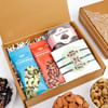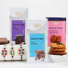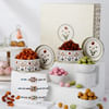 Indulge in a wholesome celebration with this rakhi hamper. Packed in a box, this hamper includes three rakhis, salted and roasted almonds, black pepper cashews, choco-walnut brownies, and roli-chawal, so you can perform the ceremony with ease. The rakhis feature a creative placement of mirrors and pearls, enhancing their beauty along with the intricate meenakari work. Each rakhi is a unique masterpiece crafted using the finest quality cotton thread.