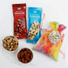 Experience the true essence of Holi with an exclusive hamper that blends traditional and modern flavors. Arranged in a brown gift box, this hamper includes pink and green organic gulaal colour pouches, peri-peri almonds and black pepper cashews in potli, a Velvety Bar Milk Chocolate, and a greeting card. Delight in the playful hues of pink and yellow organic gulaal, adding a burst of colour to your festivities. You can also gift this hamper to your loved ones, wishing them vibrant festivities.