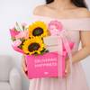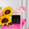 Radiant sunflowers and elegant earrings come together in a vibrant Women's Day gift that shines with appreciation. The elegant Palmonas Arc Earrings add a refined sparkle, beautifully presented in a bright pink box and a pink polka dot ribbon. Finished with a Women's Day tag, this joyful floral and jewellery gift expresses admiration, warmth, and heartfelt appreciation. - Total No. of Stems: 4 - Light Pink Spray Carnation, Sunflower, Harmosa Rose - Palmonas Arc Earrings - Base Metal: Stainless Steel - Plating: 18k Gold Tone - Waterproof and anti-tarnish, these hoops are perfect for women who love jewellery that is both bold and enduring. - Women's Day Tag - Dark Pink Sheet & Pink Polka-dot Ribbon - IGP Happiness Bag