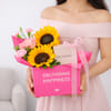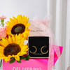 Bright sunflowers and elegant earrings come together in a vibrant gift that radiates appreciation. The sophisticated Palmonas Arc Earrings add a refined sparkle, beautifully presented in a bright pink box with a pink polka dot ribbon. Finished with a thoughtful gift tag, this joyful floral and jewelry combination expresses admiration, warmth, and heartfelt gratitude, making it the perfect gift for any occasion. Whether for a special celebration or just because, this gift is sure to bring a smile and create lasting memories. - Total No. of Stems: 4 - - Light Pink Spray Carnation, Sunflower, Harmosa Rose - - Palmonas Arc Earrings - - Base Metal: Stainless Steel - - Plating: 18k Gold Tone - - Waterproof and anti-tarnish, these hoops are perfect for
