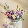 A graceful cascade of oriental pink lilies, mauve spray chrysanthemums, peach roses, deep purple roses, purple carnations, daisies, gypso, and eucalyptus, arranged in a vibrant symphony of colour and charm. Each petal carries warmth and admiration, creating an enchanting bouquet that feels timeless and heartfelt. Thoughtfully finished with a Grandparents Day tag, this creation is a beautiful way to honour their love and presence with a gift as rare as they are.