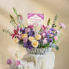 A graceful medley of blooms comes together as a luxurious celebration of colour and blessings. Oriental lilies, chrysanthemums, peach roses, carnations, and charming purple daisies unfold in perfect harmony. Fresh eucalyptus imparts a touch of gentle freshness, elevating the bouquet with its serene and uplifting essence. Each petal radiates warmth and beauty, making this exquisite floral creation a refined way to share joy, gratitude, and heartfelt wishes during Eid. - Total No. of Stems: 28 - Oriental Pink Lily, Mauve Spray Chrysanthemum, Peach & Deep Purple Rose, Purple Carnation, Purple Daisy, Eucalyptus - Eid Mubarak Tag - Basket, Macrame Boat with Handle