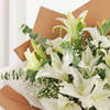 A graceful medley of purity and charm, this bouquet of white oriental lilies speaks the language of elegance. The pristine blooms are wrapped in soft brown and white frosted sheets that accentuate their serene beauty. Hand-tied with a delicate white lace ribbon, the arrangement exudes understated sophistication. Whether you are expressing gratitude, love, or warm wishes, this timeless bouquet creates a lasting impression. Perfect for celebrations or quiet moments alike, it is a refined gift that brings peace, beauty, and heartfelt emotion to any space it graces.