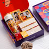 Honour your bond with this rakhi hamper crafted to delight. A heartfelt gift for brothers on rakhi, featuring a set of two handmade rakhis, including a Swastik Om motif with intricate macrame work, it brings tradition with a modern twist. The hamper also includes Joyspoon Mango Slice for a sweet treat and two personalized fridge magnets that say Love Knots and Happify Siblings with his pictures. Complete with Roli Chawal, it is a meaningful gift wrapped in love and memories. Personalize the fridge magnets with his pictures that he will use to adorn his personal space.