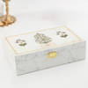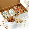 Embrace the festive spirit of Diwali with this gift hamper. Packed in a marble design kappa box, this hamper includes roasted and salted almonds and cashews, two handpainted marble elephants with embossed meena work, reusable canisters, and a greeting card. This hamper is curated to add a touch of sweet and savoury flavours to your Diwali celebrations. The elegant elephant figurines can be placed on tables or shelves, adding a sophisticated touch. Personalize the card with your name and gift this scrumptious hamper to your loved ones, extending your warmest wishes for a prosperous Diwali.