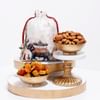 Infuse warmth and charm into your Diwali gifting with this beautifully curated hamper. Set in a silver-plated metal basket, it features a fragrant peach mandarin candle, velvety milk chocolates, a rich berry mix, and roasted almonds for a delightful indulgence. The vibrant red elephant potli adds a traditional touch, while the orange metal diyas and tea light candles bring a soft festive glow. This elegant hamper balances flavor, fragrance, and festivity, making it an ideal choice for thoughtful Diwali gifting.