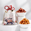 Celebrate the spirit of Diwali with a hamper that beautifully blends tradition and taste. Thoughtfully curated in a striking red elephant box with a matching festive potli, it features an orange metal diya, a tea light candle, and a Gaj Shakti Kavach hanging for auspicious beginnings. Indulge in Masqa date barfi bites, peri peri almonds, and Thai chilli cashews for a gourmet twist. Accompanied by a greeting card, this hamper makes the perfect Diwali gift for employees, clients, and business partners. Personalize the card with your brand logo to add a special touch to your Diwali gifting.