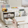 Organize your workspace in style with the Multifunctional Desktop Storage Box, a perfect blend of elegance and functionality. This versatile desktop organizer features a clear design that allows you to easily see your cosmetics, stationery, or office supplies, making it a breeze to find what you need. With two spacious drawers, it offers ample storage while maintaining a stable structure for lasting durability. The dedicated pen holder keeps your writing tools neatly arranged and accessible. Crafted from premium materials, this storage box transforms clutter into an orderly space.