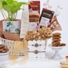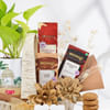 Surprise your brother with a luxurious Rakhi gift hamper that blends indulgence and tradition. This elegant hamper includes Masqa classic coffee and Madagascar dark chocolate, centre-filled cookies, and a fresh money plant in a classic planter. Featuring a set of two Peacock Feather handmade rakhis and roli chawal, this gift brings heartfelt charm to Raksha Bandhan. Beautifully arranged in a white basket wrapped in a dark brown sheet and gold tissue ribbon, it is completed with gold-sprayed dried waterlilies, a refined gesture to sweeten the sibling bond this festive season.
