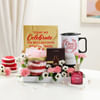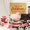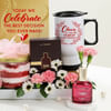 Celebrate another beautiful year of love with this thoughtfully curated anniversary gift hamper. Featuring a travel mug that reads, Cheers To Another Year Of Togetherness, and a heartfelt sandwich frame that says, Today We Celebrate The Best Decision You Ever Made. Pamper your loved one with La French Womens 30 ML Cuddle Perfume, featuring notes of frankincense, ginger, and rosemary. Enjoy a sweet treat with a red velvet cake jar, all elegantly arranged in a reusable acrylic tray decorated with pink spray carnations and Santiny white flowers. Personalize the mug with her name.