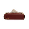 Bring elegance to your space with this maroon vegan leather tissue box cover by Bombay Artisan Company. Crafted from premium vegan leather, it boasts a water-resistant exterior that ensures durability and easy maintenance. The innovative design features an open end, allowing for effortless refilling with M fold tissues. A detachable loop adds versatility, enabling you to hang it conveniently or lay it flat. This tissue box is a stylish addition to homes, offices, or cars, bringing convenience. Personalize it with your name for perfectly blending functionality and sophistication.
