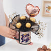 Surprise your loved ones in the new year with this charming fusion of whimsy and warmth. The enchanting black mug, embellished with the empowering words I Can And I Will, is designed to inspire every sip. Accompanying it are four handmade crispy chocolate balls, each a delectable treasure, providing a delightful crunch that smitten the taste buds. The arrangement is completed with gold-sprayed gypsophila and a lovely rose gold heart balloon. This thoughtfully curated combo embodies encouragement and sweetness. The mug is personalized with their image making it a cherished keepsake.