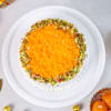 Celebrate Diwali with a delightful twist with this 300 gm fusion masterpiece. A smooth, pristine white frosting base meets a luscious motichoor layer on top, combining the elegance of a classic cake with the rich, traditional flavours of festive Indian sweets. Finely sliced pistachios add a pop of colour and subtle crunch, while a shimmering gold 'Happy Diwali' topper brings a touch of festive glamour. Perfect for gifting, sharing, or adding a gourmet twist to your celebrations, this indulgent dessert beautifully fuses tradition and modernity in every bite.