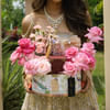 A Rosy Heirloom evokes a sense of timeless elegance and cherished beauty. Soft hues of cerise pink, aqua pink, and sweet avalanche roses bloom alongside light pink spray carnations, resting within a contemporary Kalamkari trunk. Paired with pistachios, a wholesome mix, and a tuberose jasmine luxury candle, all adorned with a pearled edge ribbon, it is a delicate keepsake of grace and indulgence.