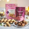 Set the tone for festive indulgence with this luxury Diwali hamper. Sweet avalanche roses, mini pink gerberas and pink santini bloom alongside Spiced hibiscus and rose floral tea, almond biscotti fingers, Protein bites- mixed berries, Rich Doda barfi sweets, Strawberry choco pretzels, block print drawstring bag with salted and roasted almonds, and salted and roasted cashews with white lotus shub labh hangings, pink gold finish metal diyas in an off white tray. Presented with curated block printed mugs and festive accents, it is a radiant expression of love and togetherness.