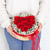 Captivate your beloved's heart with this enchanting marvel. Presented in a chic beige box, it features delicate gypso flowers meticulously shaped into a heart, cradling vibrant red roses symbolizing passion and devotion. Adorned with a radiant red ribbon, this arrangement represents love's depth and beauty. Embrace the sentiment of love as this captivating ensemble becomes a poetic expression of affection, a perfect gift to evoke cherished emotions and celebrate the essence of love.