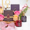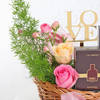 Embrace nature's beauty in elegance with this stunning arrangement. Arranged elegantly in a cane basket, this arrangement features the freshest aqua pink roses, spray, and peach roses, with Cuddle women's perfume, Bespoke men's perfume, and an acrylic love tag. The enchanting allure of Men's Bespoke Eau De Parfum blends a burst of citrusy freshness with delicate florals like rose and jasmine, while the Women's Cuddle Eau De Parfum is an exquisite scent with the essence of fresh roses, followed by the velvety aroma of vanilla, which infuses warmth and sensuality.