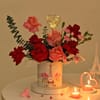Romance blooms beautifully the moment this arrangement enters the room. Five rich red roses express deep passion, while three soft Hermoza roses add a gentle romantic touch. Two pink spray carnations bring sweetness, balanced by fresh eucalyptus that adds texture and calm greenery. Styled in a chic Paris-themed cylindrical box, the glowing heart LED tag and playful 3D love accent elevate the mood instantly. Designed for couples, it transforms Valentine's Day into an intimate, picture-perfect moment. Chosen as the best Valentine's Day gift, it blends elegance, warmth, and heartfelt emotion effortlessly.