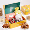 Make Karwa Chauth truly memorable with this thoughtfully curated essentials hamper that blends tradition with indulgence. Inside, you will find a classic red steel Karwa, paired with a red elephant potli filled with puja samgris like bindi, mehendi, roli chawal with containers, mouli, kajal, and sindoor, everything needed for the rituals. To sweeten the occasion, the hamper includes salted roasted almonds, roasted salted cashews, and rich chana badam barfi. Finished with a card featuring Chauth Mata, this set is the perfect way to honor tradition while delighting the senses.
